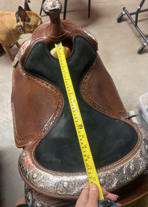 Seller's Description: Dale Chavez 16.5” Custom Western Show Saddle, Headstall, Romal Reins, and Saddle Cover -Gullet: 7” -Skirt Length: 28”