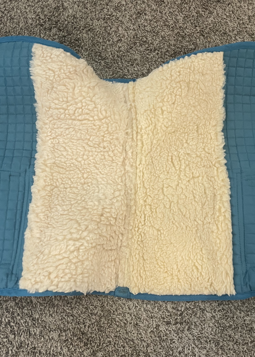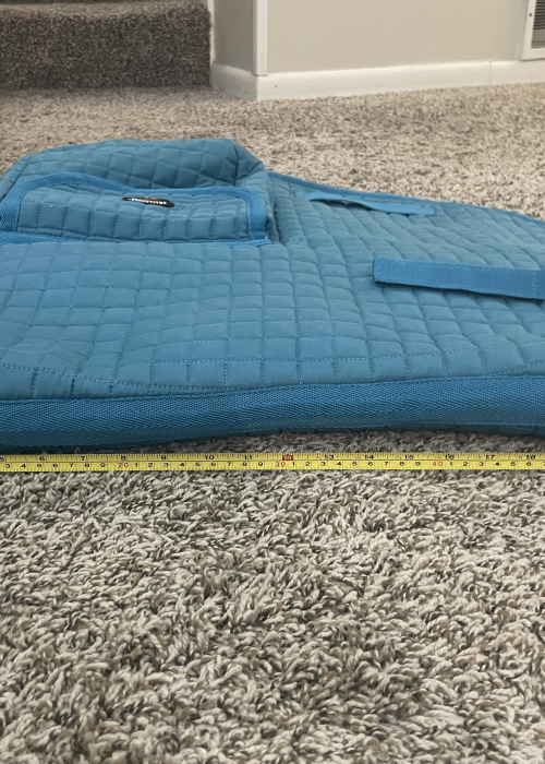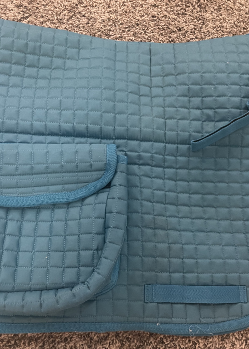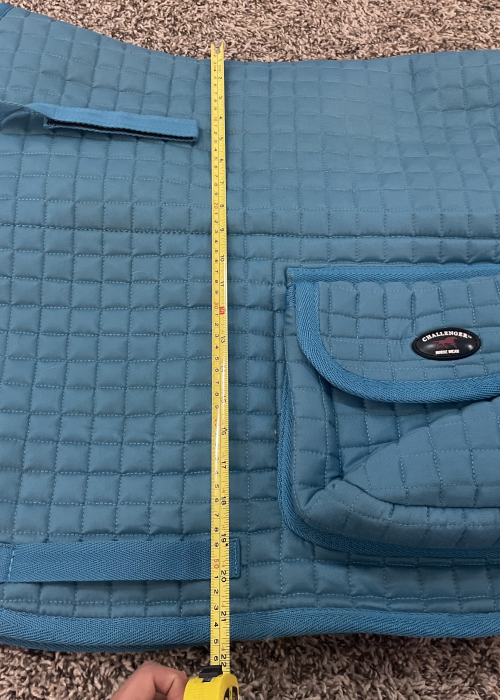 Seller's Description: Only used a handful of times. Perfect for trails! Approximately 23" x 21.5". The Velcro pockets are big enough for your water bottle, cell phone, spare lead rope, snacks, or anything else you might need on an outing. Fleece lining makes it extra comfy for your horse and helps wick away sweat.