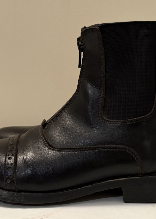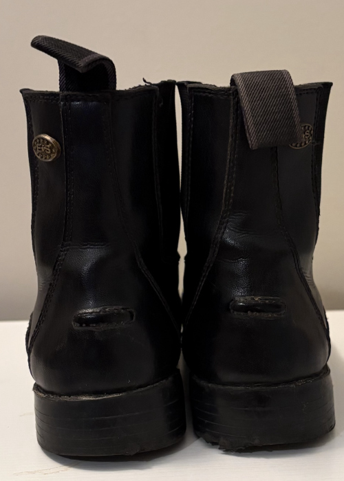Seller's Description: This a pair of Equistar Paddock Boots. They are in good condition but there is a small crack on the inside of the right boot. They zip up the front and they are extremely comfy to ride in. They are a child’s size one and they are a perfect starter boot for a child’s first ride!
