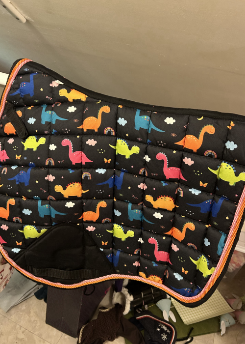 Seller's Description: Dinosaur saddle pad, boots, and bonnet Full size